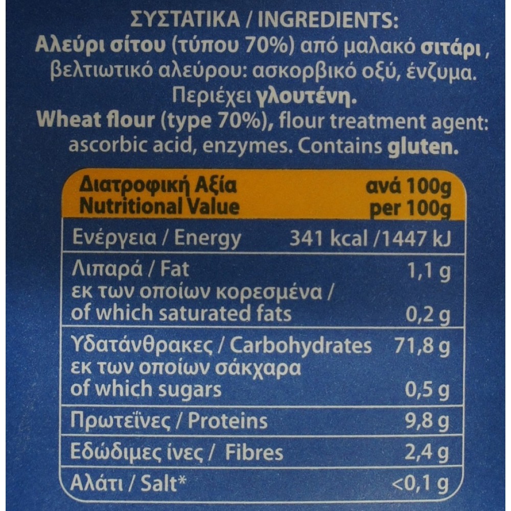 Αλεύρι σίτου (τύπου 70%) από μαλακό σιτάρι, βελτιωτικό αλεύρου: ασκορβικό οξύ, ένζυμα.