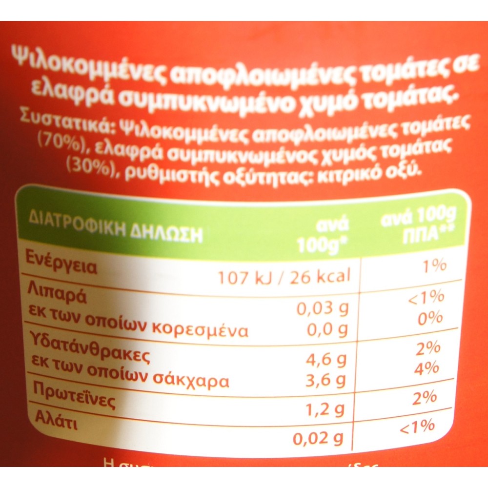 Ψιλοκομμένες αποφλοιωμένες τομάτες (70%), ελαφρά συμπηκνωμένος χυμός τομάτας (30%), ρυθμιστής οξύτητας: κιτρικό οξύ