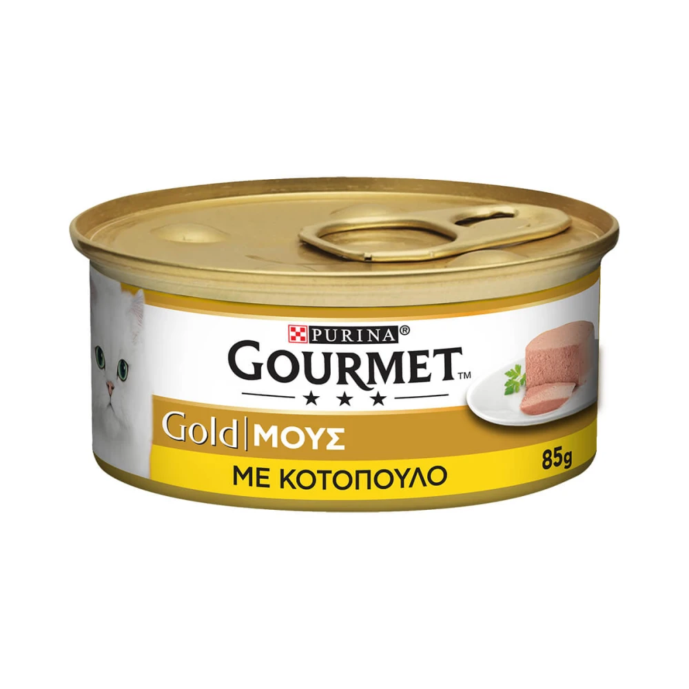 Πλήρης Τροφή για Ενήλικες Γάτες GOURMET GOLD ΜΟΥΣ ΜΕ ΚΟΤΟΠΟΥΛΟ 85g. Η γάτα σας λατρεύει να ανακαλύπτει καθημερινά νέες και διαφορετικές γεύσεις και υφές. Για αυτό το λόγο η GOURMET GOLD δημιούργησε το Μους – μια εύγευστη συνταγή που θα την κακομάθει με μια διαφορετική γευστική εμπειρία σε κάθε γεύμα. Η GOURMET GOLD με Κοτόπουλο είναι μία πλήρης τροφή για ενήλικες γάτες που περιέχει όλες τις βιταμίνες και τα ανόργανα άλατα που χρειάζεται καθημερινά. Η GOURMET GOLD αποτελεί μια μαλακή μούς με κοτόπουλο, προσεκτικά προετοιμασμένη για να προσφέρει στη γάτα σας την απόλαυση μιας φίνας, απαλής αίσθησης καλύπτοντας παράλληλα όλες τις διατροφικές της ανάγκες.