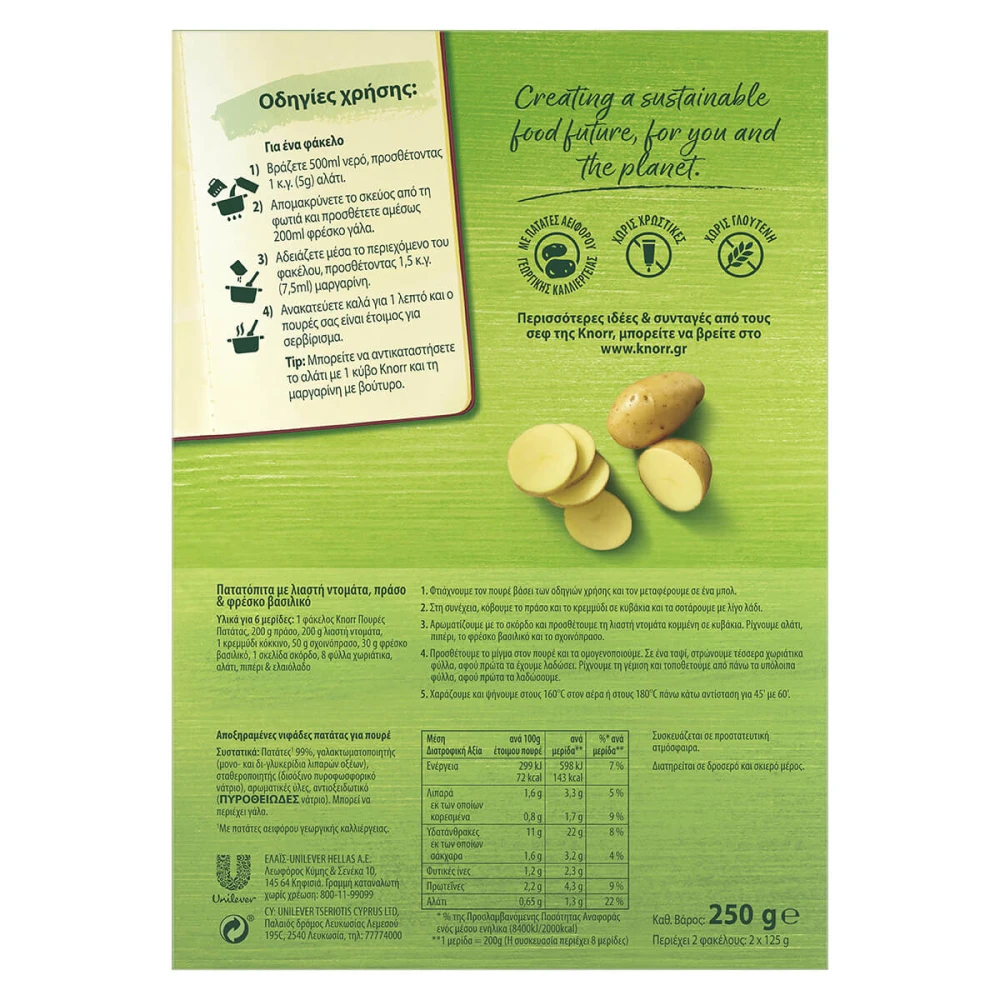 Πουρές πατάτας Knorr από επιλεγμένες πατάτες ελεγχόμενης καλλιέργειας, που εξασφαλίζουν σταθερή ποιότητα και φυσική γεύση. Έτοιμος σε μόλις 1 λεπτό, αποτελεί ιδανική λύση για γρήγορα και απολαυστικά συνοδευτικά.