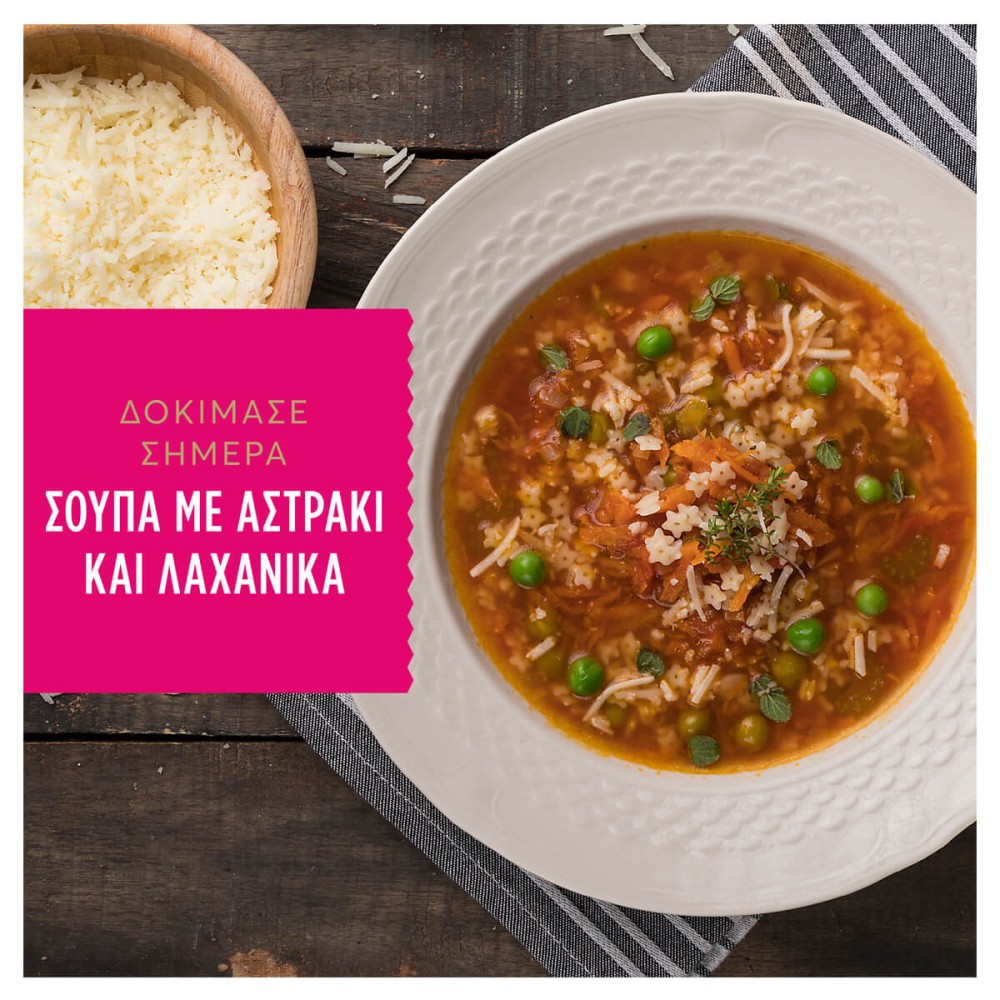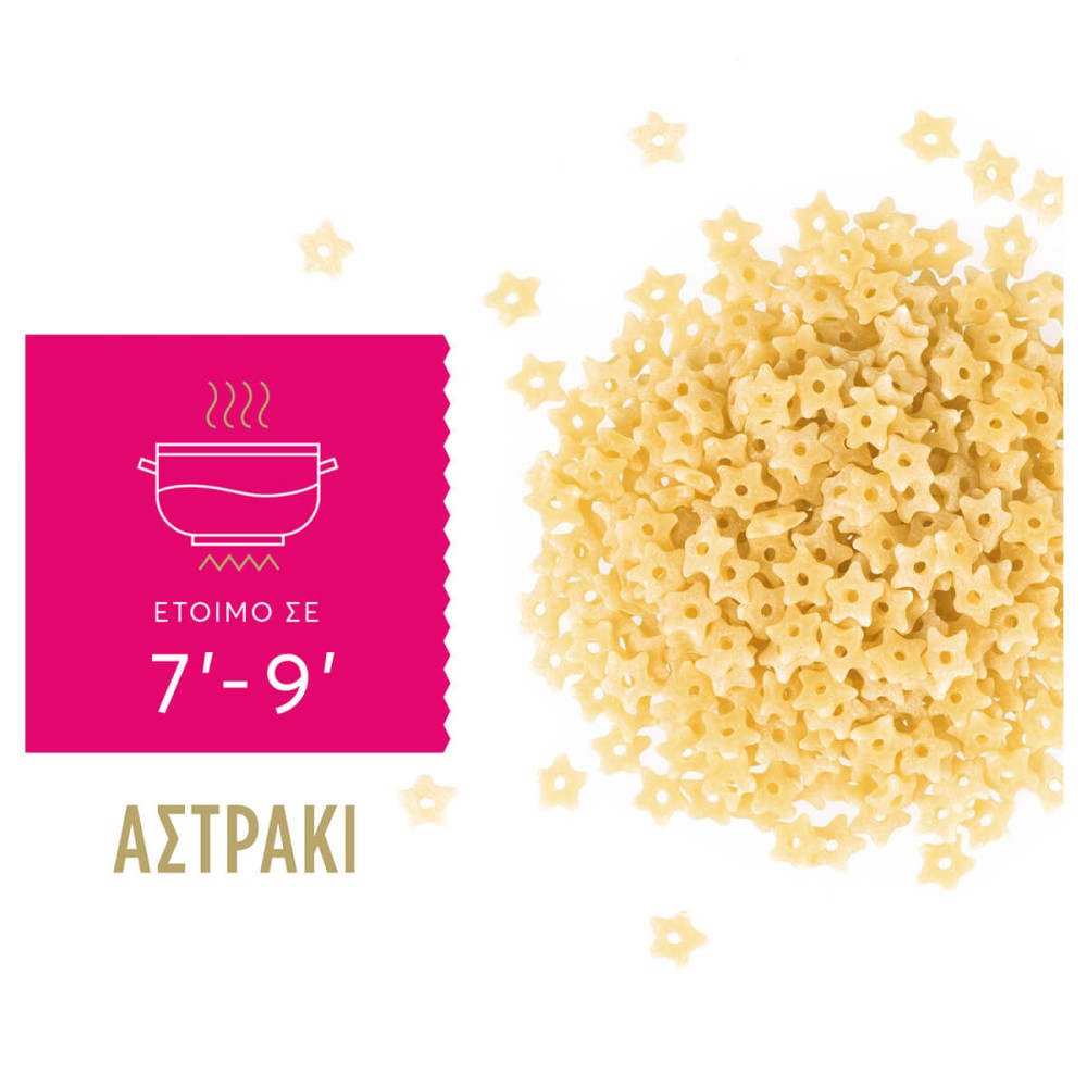 Το προτιμάτε για την ξεχωριστή του εμφάνιση και την αδυναμία που του δείχνουν οι μικροί μας φίλοι. Έχει τη μορφή αστεριού και κάνει τις σούπες σας να ξεχωρίζουν και εσάς … να λάμπετε από υπερηφάνια! Χρησιμοποιήστε το και σε σαλάτες με όποια συνταγή ταιριάζει στο δικό σας στυλ μαγειρικής και … καλή σας όρεξη!