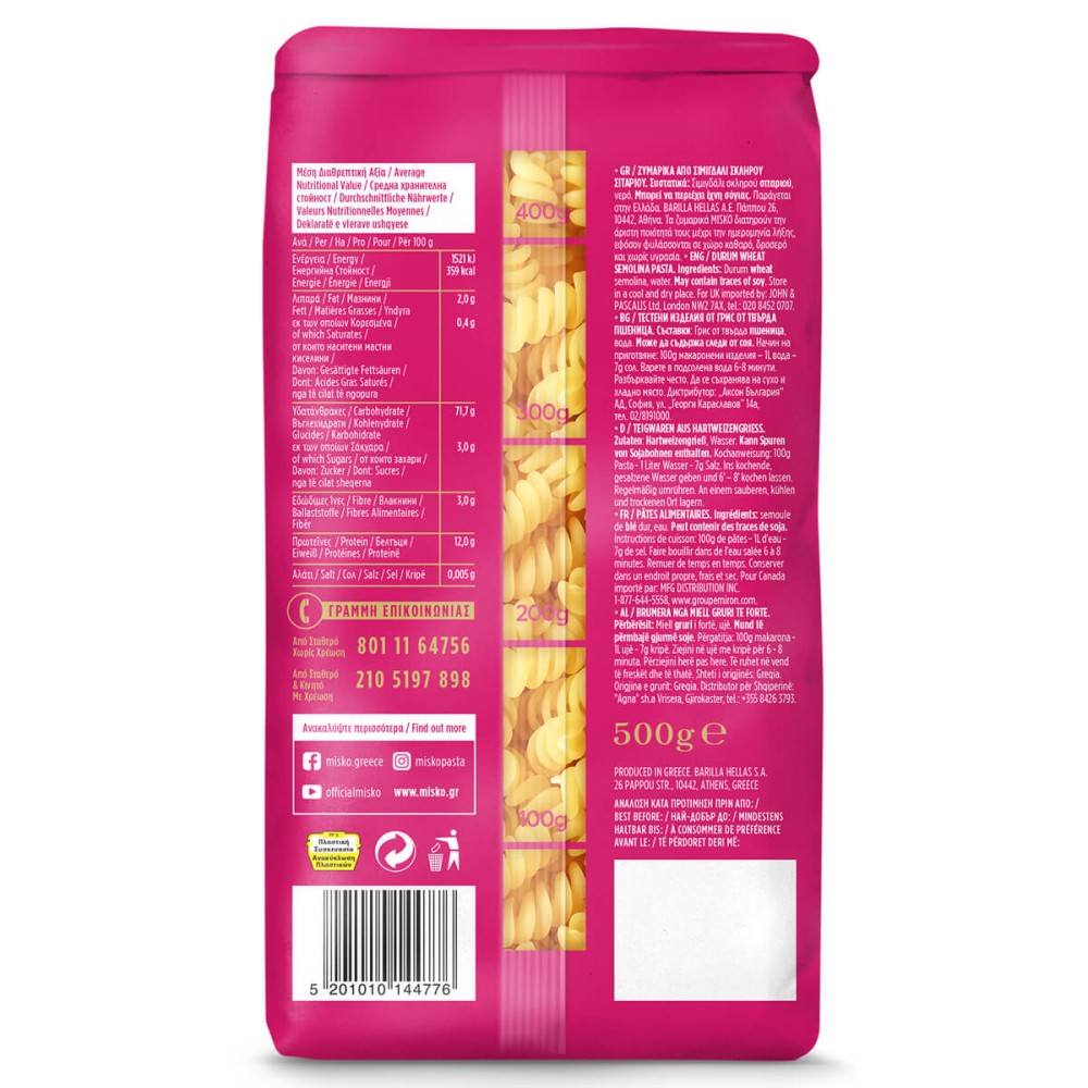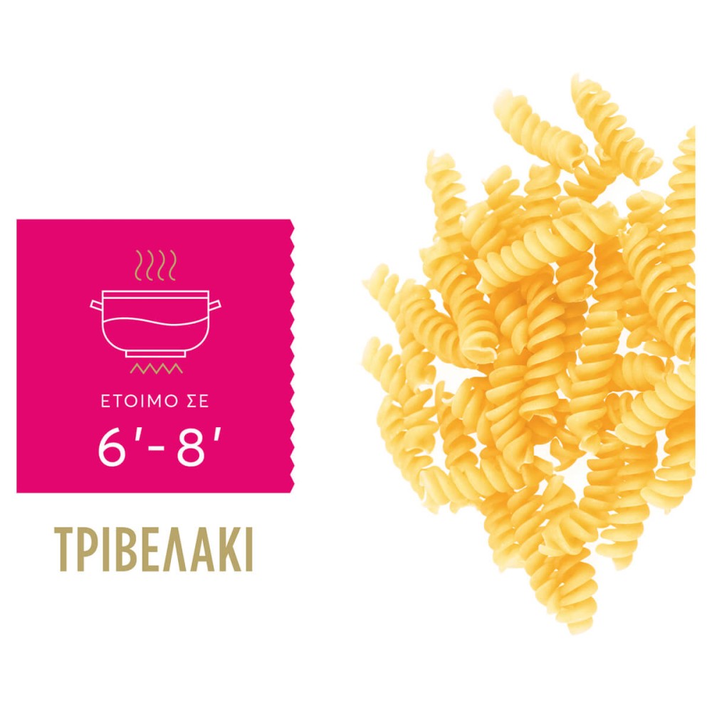 Είναι το πιο «παιχνιδιάρικο» είδος κοντού ζυµαρικού σε σχήµα ελατηρίου που εκτοξεύει την απόλαυση στα ύψη. Το προτιµάτε γιατί «πάει µε όλα», δίνει µοναδική νοστιµιά στις κόκκινες και άσπρες σάλτσες και αποτελεί τον ιδανικό σύµµαχο για µια µεγάλη ποικιλία σαλατών. Στριφογυρίστε τη σκέψη σας µαζί του και δηµιουργήστε από τις πιο απλές µέχρι τις πιο πρωτότυπες συνταγές και εµφανίσεις στο πιάτο!