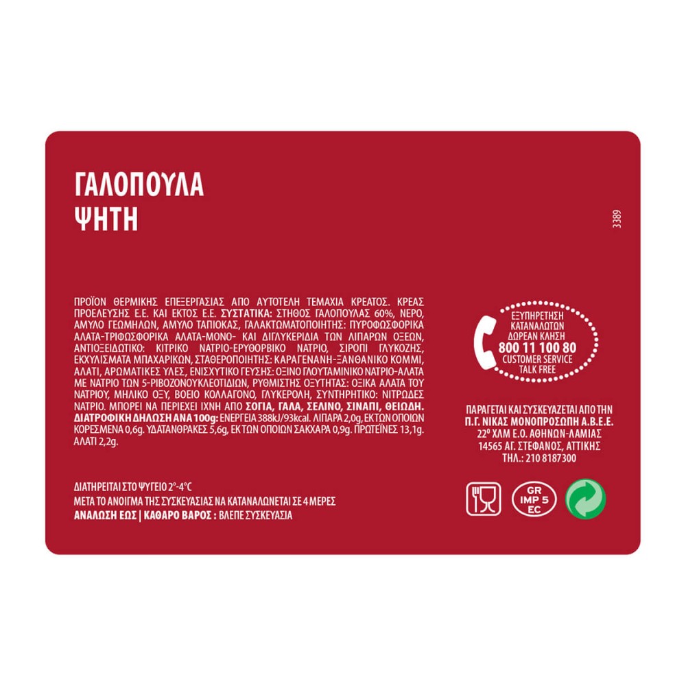 Φιλέτο γαλοπούλας (55%), νερό, τροποποιημένο άμυλο, μαγειρικό αλάτι, δεξτρόζη, εξαιρετικό παρθένο ελαιόλαδο (1%), πηκτωματογόνο: καραγεννάνη, πρωτεΐνη σόγιας, πρωτεΐνη γάλακτος, αρωματικές ύλες, σταθεροποιητές: τριφωσφορικά άλατα, αντιοξειδωτικό: ερυθορβικό νάτριο, υδρολυμένη φυτική πρωτεΐνη, συντηρητικό: νιτρώδες νάτριο, αρτύματα καπνιστών τροφίμων.