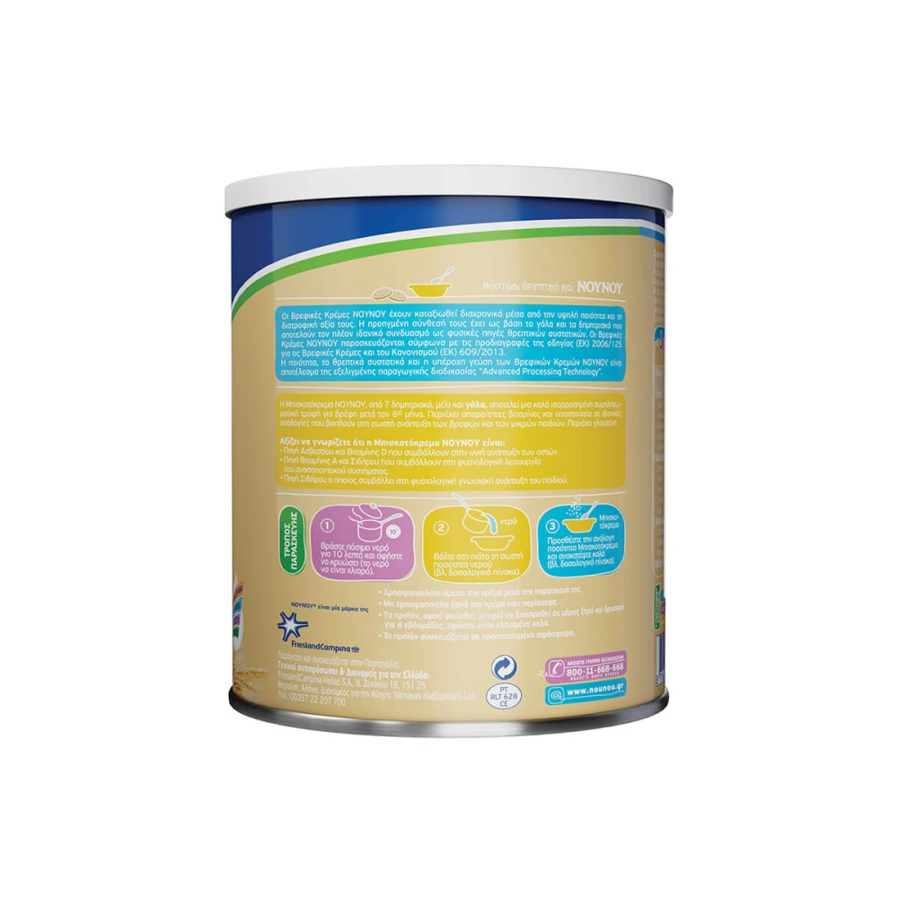 Η Μπισκοτόκρεμα ΝΟΥΝΟΥ με 7 Δημητριακά, μέλι και γάλα, αποτελεί μία καλά ισορροπημένη συμπληρωματική τροφή για βρέφη μετά τον 6ο μήνα. Περιέχει απαραίτητες βιταμίνες ιχνοστοιχεία σε ιδανικές αναλογίες που βοηθούν στη σωστή ανάπτυξη των βρεφών και των μικρών παιδιών. Περιέχει γλουτένη. Αξίζει να γνωρίζετε ότι η Μπισκοτόκρεμα ΝΟΥΝΟΥ είναι:
