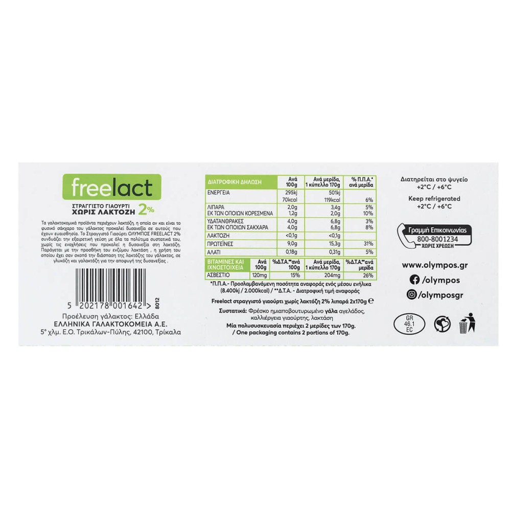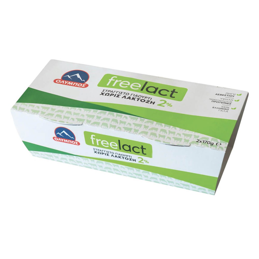 Το στραγγιστό γιαούρτι 2% ΟΛΥΜΠΟΣ "Freelact" παράγεται από 100% ελληνικό φρέσκο ημιαποβουτυρωμένο γάλα αγελάδας, με τη διαδικασία της φυσικής στράγγισης. Συνδυάζει την εξαιρετική γεύση με όλα τα πολύτιμα συστατικά του, χωρίς τις ενοχλήσεις που προκαλεί η δυσανεξία στη λακτόζη. Έτσι, τώρα μπορείτε να απολαμβάνετε όλα τα καλά του στραγγιστού γιαουρτιού. Το μόνο που του λείπει είναι η λακτόζη.