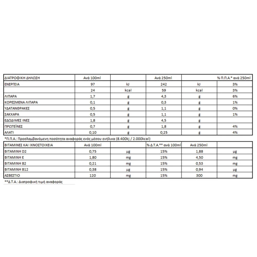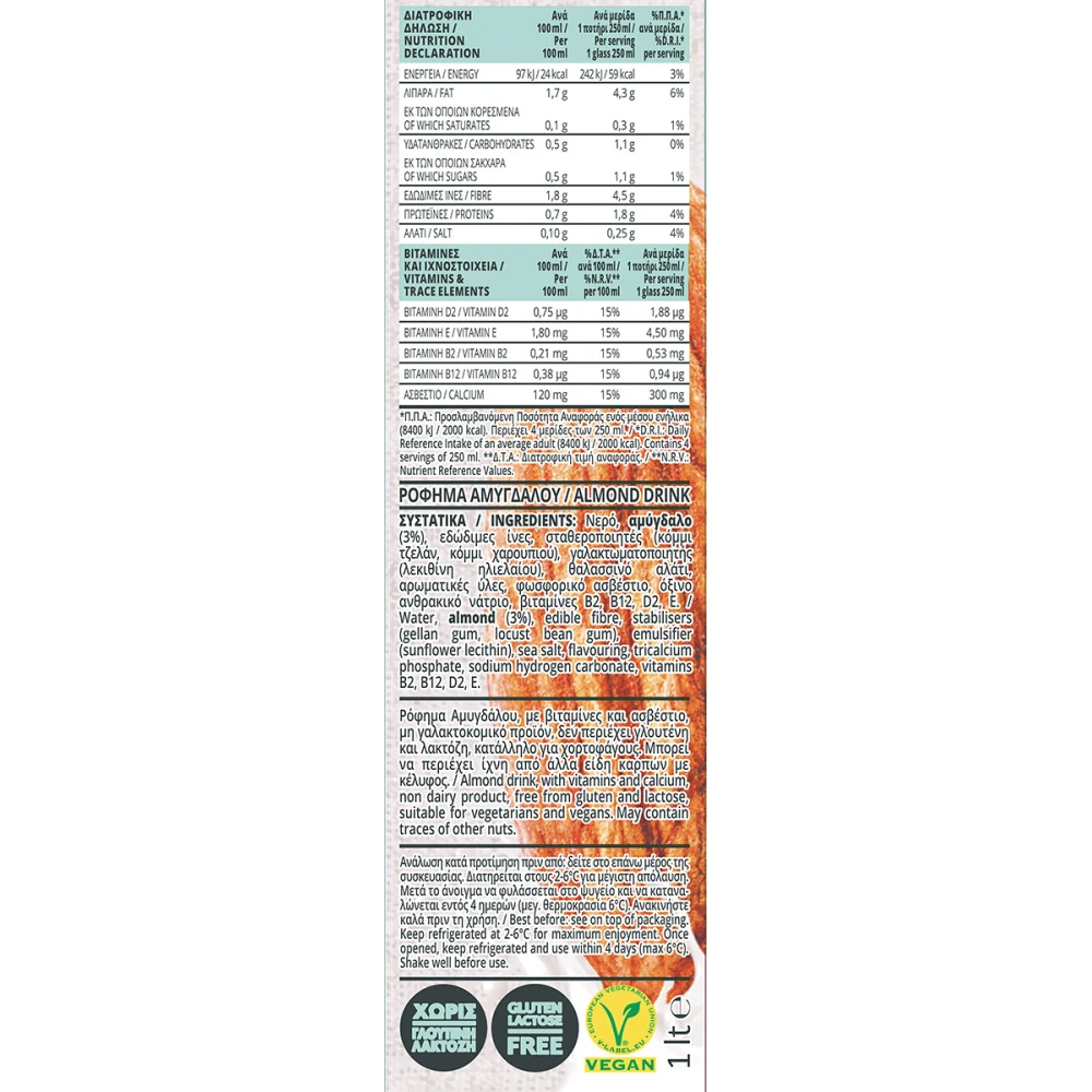Νερό, αμύγδαλο (3%), εδώδιμες ίνες, σταθεροποιητές (κόμμι τζελάν, κόμμι χαρουπιού), γαλακτωματοποιητής (λεκιθίνη ηλιελαίου), θαλασσινό αλάτι, αρωματικές ύλες, φωσφορικό ασβέστιο, όξινο ανθρακικό νάτριο, βιταμίνες Β2, Β12, D2, E.