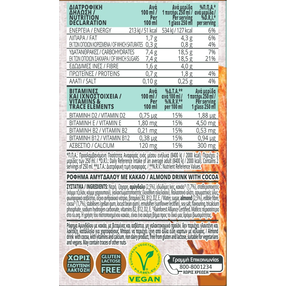 Νερό, ζάχαρη, αμύγδαλο (2,5%), εδώδιμες ίνες, κακάο (1,7%), σταθεροποιητές (κόμμι τζελάν, κόμμι χαρουπιού), γαλακτωματοποιητής (λεκιθίνη ηλιελαίου), θαλασσινό αλάτι, αρωματικές ύλες, φωσφορικό ασβέστιο, όξινο ανθρακικό νάτριο, βιταμίνες Β2, Β12, D2, E.