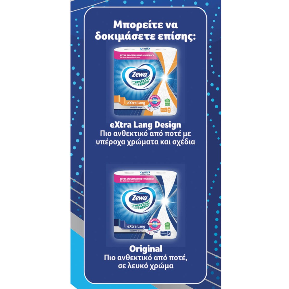 Με αυτό το δίφυλλο χαρτί κουζίνας μπορείτε να αποφασίσετε εύκολα πόσο χαρτί θέλετε να χρησιμοποιήσετε. Τα φύλλα είναι πιο μικρά κι έτσι το μήκος του χαρτιού μπορεί να προσαρμοστεί σε κάθε οικιακή ανάγκη. Φυσικά, είναι απορροφητικό και αξιόπιστο όπως και τα άλλα προϊόντα Wisch&Weg.