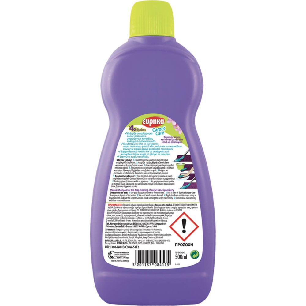Σκουπίστε με την ηλεκτρική σκούπα για να απομακρύνετε τη σκόνη. Αναμίξτε ένα μέρος Εύρηκα Carpet Care σαμπουάν με 8 μέρη ζεστού νερού. Ανακατέψτε μέχρι να δημιουργηθεί πλούσιος αφρός. Απλώστε τον αφρό στο χαλί με μια βούρτσα ή ένα πανί και τρίψτε. Προσοχή: Μη βρέξετε υπερβολικά το χαλί. Αφήστε να στεγνώσει, μην ξεπλύνετε. Σκουπίστε ξανά με την ηλεκτρική σκούπα. Πριν τη χρήση δοκιμάστε το προϊόν σε μικρή επιφάνεια του χαλιού ώστε να διαπιστώσετε την ανθεκτικότητα των χρωμάτων. Μετά τη χρήση ξεπλύνετε καλά τα χέρια σας. Μη χρησιμοποιείτε το προϊόν σε περσικά χαλιά, υφάσματα που χρειάζονται στεγνό καθάρισμα ή σε υφάσματα όπως βελούδο, δέρμα και μετάξι.