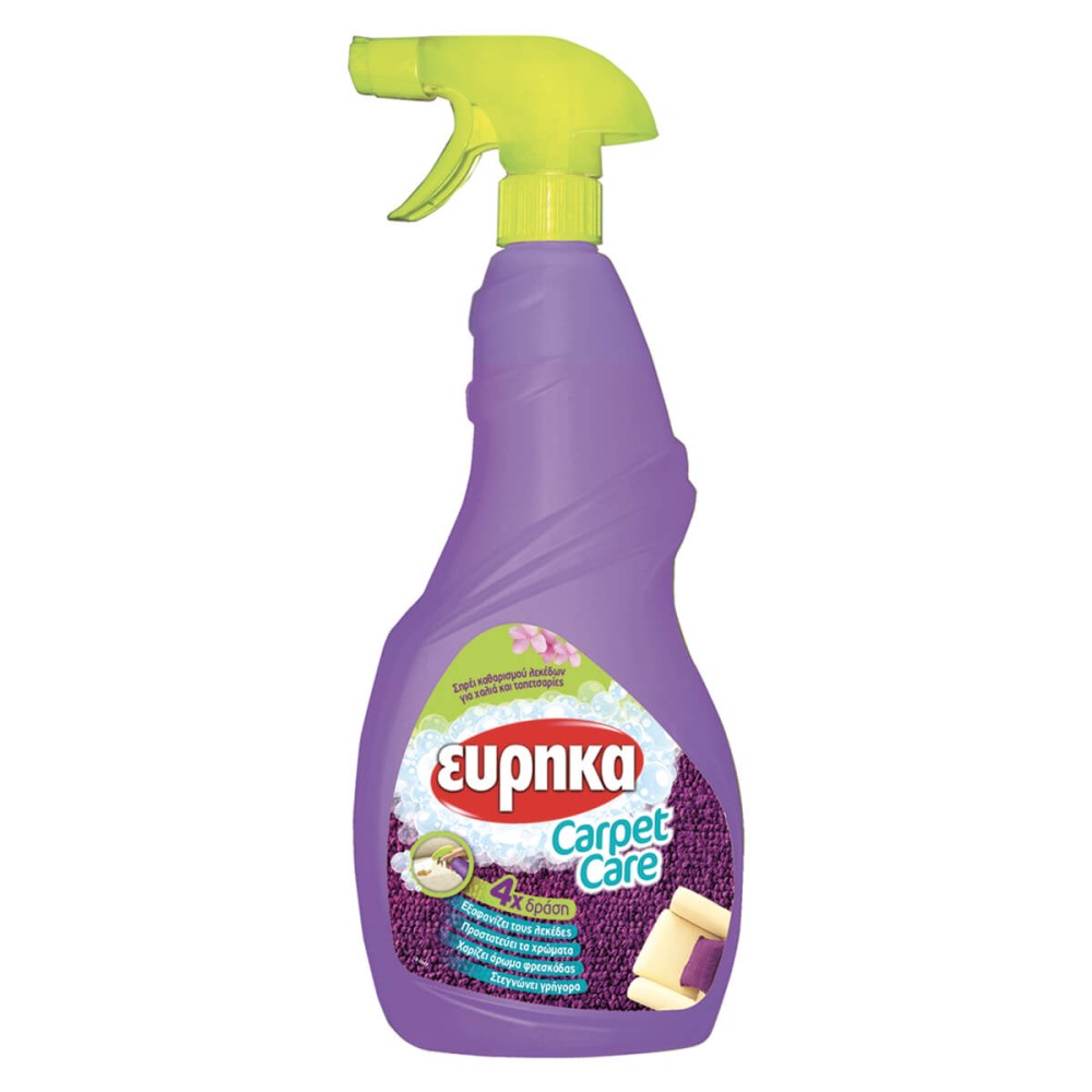 Το spray Εύρηκα Carpet Care με 4x δράση, διασπά και απομακρύνει ακόμη και τους πιο δύσκολους λεκέδες όπως λάδι, κρασί, σοκολάτα κλπ. εύκολα και γρήγορα από χαλιά, ταπετσαρίες, μοκέτες, καναπέδες και άλλες υφασμάτινες επιφάνειες που πλένονται. Στεγνώνει γρήγορα, προστατεύει τα χρώματα, και χαρίζει άρωμα φρεσκάδας.
