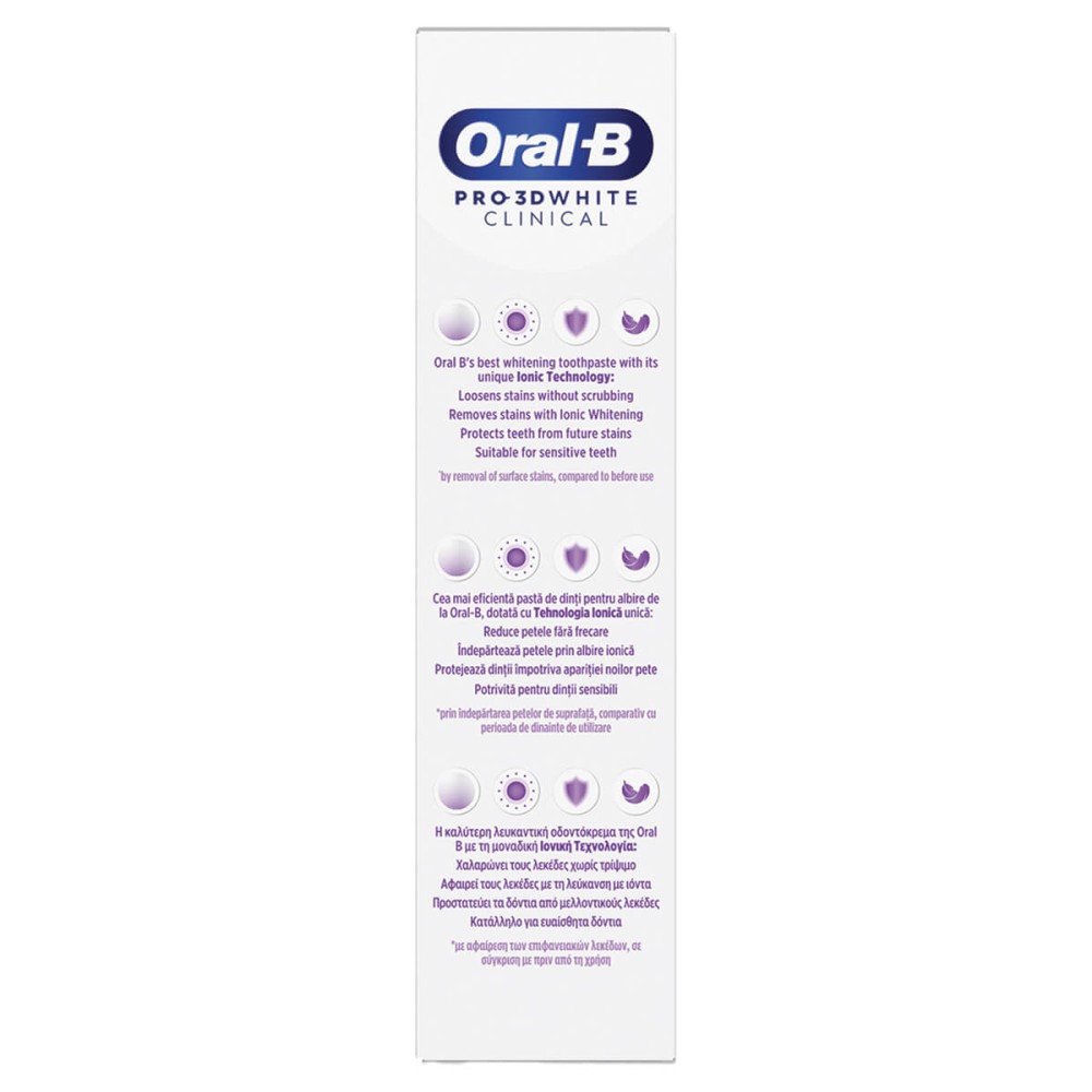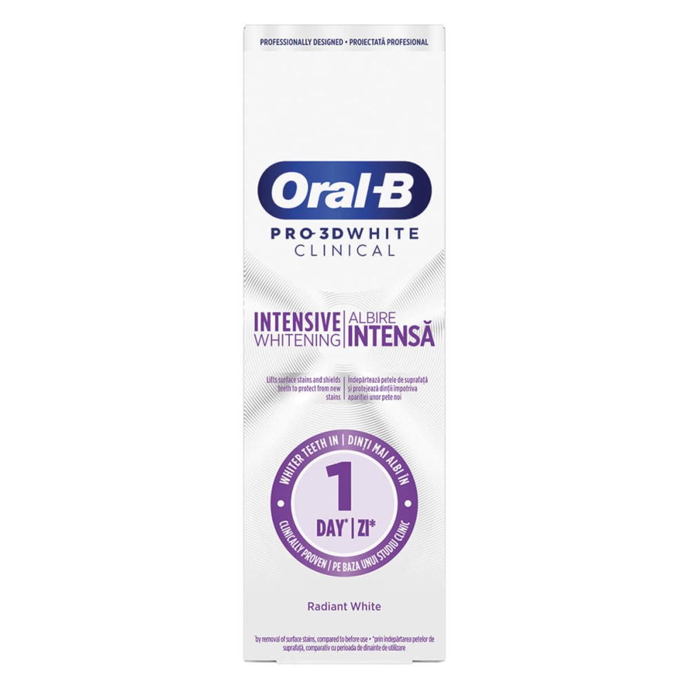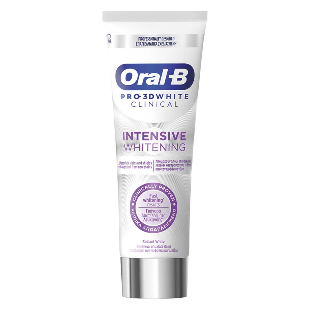 Η οδοντόκρεμα λεύκανσης Oral-B Pro 3D White Clinical Intensive Whitening είναι κλινικά αποδεδειγμένη για πιο λευκά δόντια σε 1 ημέρα, με την αφαίρεση των επιφανειακών λεκέδων. Η καλύτερη οδοντόκρεμα λεύκανσης της Oral B με τη μοναδική Τεχνολογία ιόντων: Χαλαρώνει τους λεκέδες χωρίς τρίψιμο, αφαιρεί τους λεκέδες με λεύκανση με ιόντα, προστατεύει τα δόντια από μελλοντικούς λεκέδες και είναι κατάλληλο για ευαίσθητα δόντια.