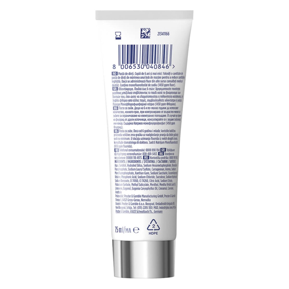 Παιδιά έως 6 ετών: Χρησιμοποιείτε ποσότητα μεγέθους μπιζελιού επιβλέποντας το παιδί κατά το βούρτσισμα των δοντιών του, έτσι ώστε να ελαχιστοποιείται η πιθανότητα κατάποσης. Αν ληφθεί φθόριο από άλλες πηγές, συμβουλευθείτε οδοντίατρο ή γιατρό. Περιέχει Μονοφθοροφωσφορικό νάτριο (1450 ppm Φθορίου).