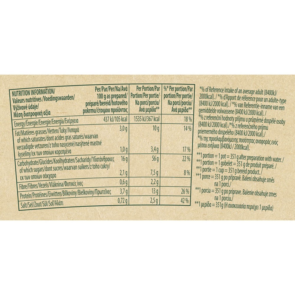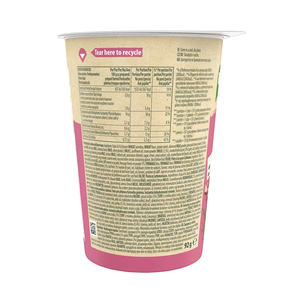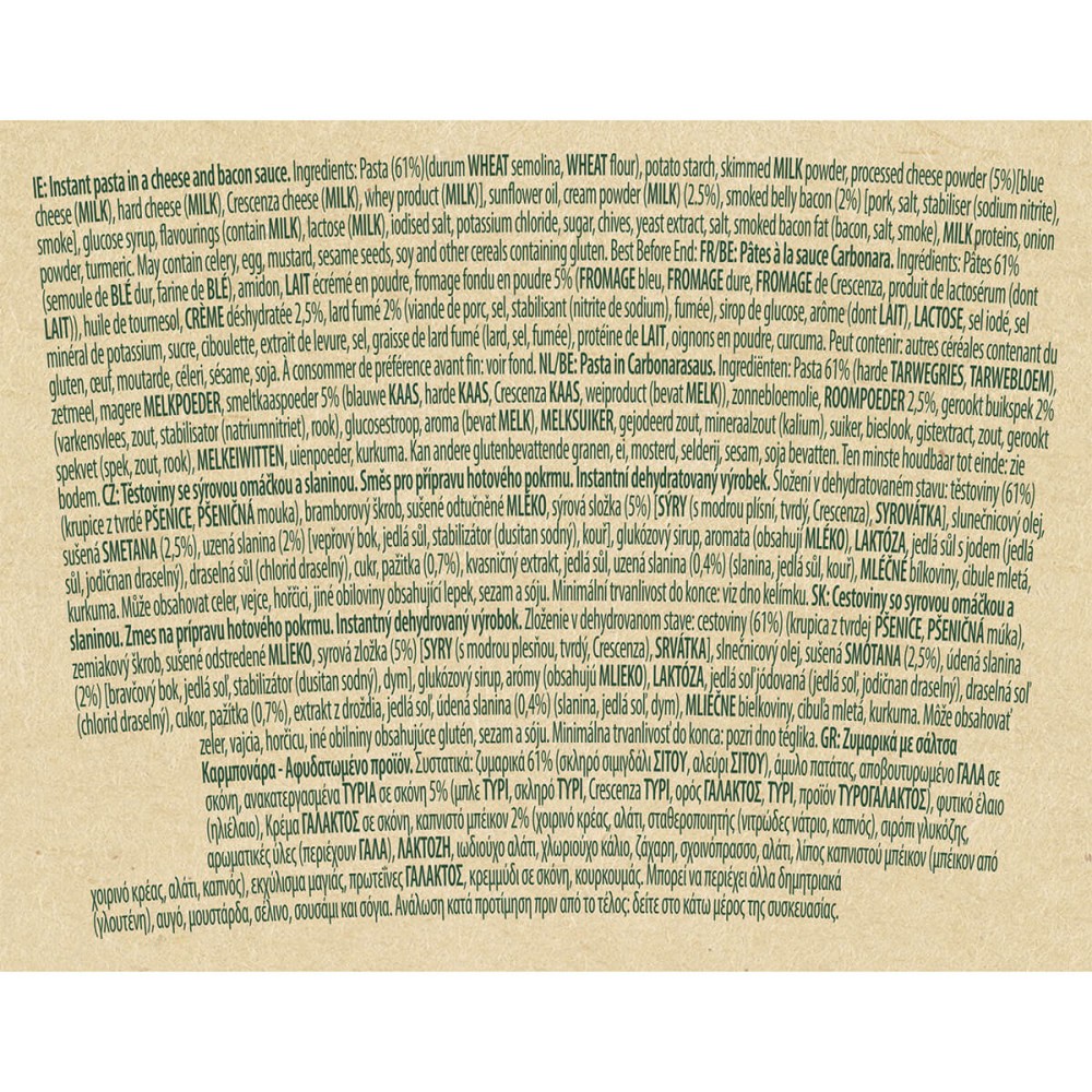 Ζυμαρικά 58%(από σκληρό σιμιγδάλι ΣΙΤΟΥ),κρέμα ΓΑΛΑΚΤΟΣ σε σκόνη 12%,άμυλο πατάτας,ανακατεργασμέναΤΥΡΙΑ σε σκόνη 5,2%(ΤΥΡΙ blue Cheese, σκληρόΤΥΡΙ,ΤΥΡΙ Crescenza,ορός ΓΑΛΑΚΤΟΣ), φυτικό λίπος(φοινικέλαιο),σιρόπι γλυκόζης,καπνιστό μπέικον 2,1% (χοιρινό κρέας,αλάτι, σταθεροποιητής(νιτρώδες νάτριο),καπνός), ιωδιούχο αλάτι,αρωματικές ύλες,ζάχαρη,σχοινόπρασσο¹ 0,8%,χλωριούχο κάλιο, πρωτεΐνες ΓΑΛΑΚΤΟΣ, λίπος καπνιστού μπέικον (μπέικον από χοιρινό κρέας, αλάτι, καπνός) , αλάτι, εκχύλισμα μαγιάς, κρεμμύδι σε σκόνη¹, κουρκουμάς¹. Μπορεί να περιέχει άλλα δημητριακά (γλουτένη), σέλινο,αυγό, μουστάρδα, σουσάμι και σόγια. ¹Αειφόρου γεωργικής καλλιέργειας.