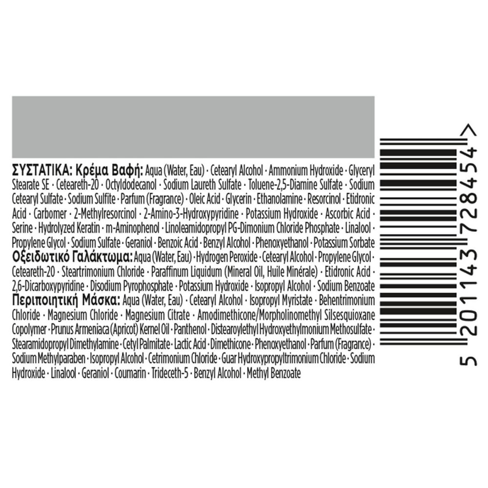 ΟΔΗΓΙΕΣ ΑΣΦΑΛΟΥΣ ΧΡΗΣΗ: Οι βαφές μαλλιών μπορεί να προκαλέσουν σοβαρές αλλεργικές αντιδράσεις. Διαβάστε και ακολουθήστε τις οδηγίες. Αυτό το προϊόν δεν προορίζεται για χρήση σε άτομα ηλικίας κάτω των 16 ετών. Τα προσωρινά τατουάζ «μαύρης χέννας» μπορεί να σας αυξήσουν τον κίνδυνο αλλεργίας. Μη βάφετε τα μαλλιά σας εάν: – έχετε εξάνθημα στο πρόσωπό σας ή ευαίσθητο, ερεθισμένο και πληγωμένο τριχωτό της κεφαλής, – είχατε ποτέ οποιαδήποτε αντίδραση μετά το βάψιμο των μαλλιών σας, – είχατε, στο παρελθόν, αντίδραση σε προσωρινό τατουάζ «μαύρης χέννας». ΠΡΟΣΟΧΗ: Περιέχει υπεροξείδιο του υδρογόνου, φαινυλενοδιαμίνες (διαμινοτολουόλια), ρεσορκινόλη και αμμωνία. Διαβάστε όλα τα συστατικά στο κάτω μέρος του κουτιού. Αποφύγετε την επαφή με τα μάτια. Ξεπλύνετε αμέσως αν το προϊόν έλθει σε επαφή με αυτά. Να μη χρησιμοποιείται για βάψιμο φρυδιών ή βλεφαρίδων. Μετά την εφαρμογή, ξεβγάλετε καλά τα μαλλιά. Φοράτε κατάλληλα γάντια. Κάντε ένα προληπτικό τεστ αλλεργίας 48 ώρες πριν από κάθε βαφή, ακόμα και αν έχετε ξαναχρησιμοποιήσει χρωστικά προϊόντα. Θυμηθείτε λοιπόν να αγοράζετε το προϊόν 48 ώρες πριν τη χρήση. Εάν υπάρξει οποιαδήποτε αντίδραση ή εάν έχετε αμφιβολία, ζητήστε ιατρική συμβουλή πριν χρησιμοποιήσετε οποιοδήποτε χρωστικό προϊόν. Κρατήστε το προϊόν μακριά από παιδι