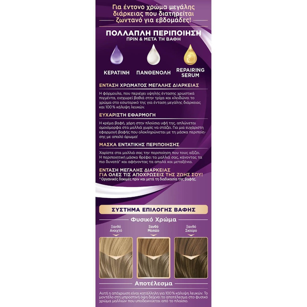 Η φόρμουλα της βαφής και η μάσκα περιποίησης, σε συνδιασμό με το Σύστημα Τριπλής Περιποίησης - με Κερατίνη, Πανθενόλη και Nutri-Oil - περιποιουνται τα μαλλιά.