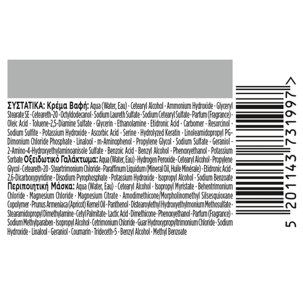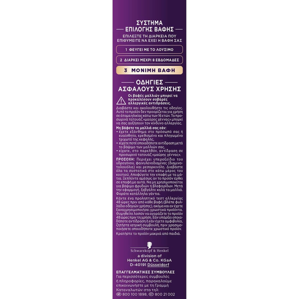 ΟΔΗΓΙΕΣ ΑΣΦΑΛΟΥΣ ΧΡΗΣΗ: Οι βαφές μαλλιών μπορεί να προκαλέσουν σοβαρές αλλεργικές αντιδράσεις. Διαβάστε και ακολουθήστε τις οδηγίες. Αυτό το προϊόν δεν προορίζεται για χρήση σε άτομα ηλικίας κάτω των 16 ετών. Τα προσωρινά τατουάζ «μαύρης χέννας» μπορεί να σας αυξήσουν τον κίνδυνο αλλεργίας. Μη βάφετε τα μαλλιά σας εάν: – έχετε εξάνθημα στο πρόσωπό σας ή ευαίσθητο, ερεθισμένο και πληγωμένο τριχωτό της κεφαλής, – είχατε ποτέ οποιαδήποτε αντίδραση μετά το βάψιμο των μαλλιών σας, – είχατε, στο παρελθόν, αντίδραση σε προσωρινό τατουάζ «μαύρης χέννας». ΠΡΟΣΟΧΗ: Περιέχει υπεροξείδιο του υδρογόνου, φαινυλενοδιαμίνες (διαμινοτολουόλια), ρεσορκινόλη και αμμωνία. Διαβάστε όλα τα συστατικά στο κάτω μέρος του κουτιού. Αποφύγετε την επαφή με τα μάτια. Ξεπλύνετε αμέσως αν το προϊόν έλθει σε επαφή με αυτά. Να μη χρησιμοποιείται για βάψιμο φρυδιών ή βλεφαρίδων. Μετά την εφαρμογή, ξεβγάλετε καλά τα μαλλιά. Φοράτε κατάλληλα γάντια. Κάντε ένα προληπτικό τεστ αλλεργίας 48 ώρες πριν από κάθε βαφή, ακόμα και αν έχετε ξαναχρησιμοποιήσει χρωστικά προϊόντα. Θυμηθείτε λοιπόν να αγοράζετε το προϊόν 48 ώρες πριν τη χρήση. Εάν υπάρξει οποιαδήποτε αντίδραση ή εάν έχετε αμφιβολία, ζητήστε ιατρική συμβουλή πριν χρησιμοποιήσετε οποιοδήποτε χρωστικό προϊόν. Κρατήστε το προϊόν μακριά από παιδι