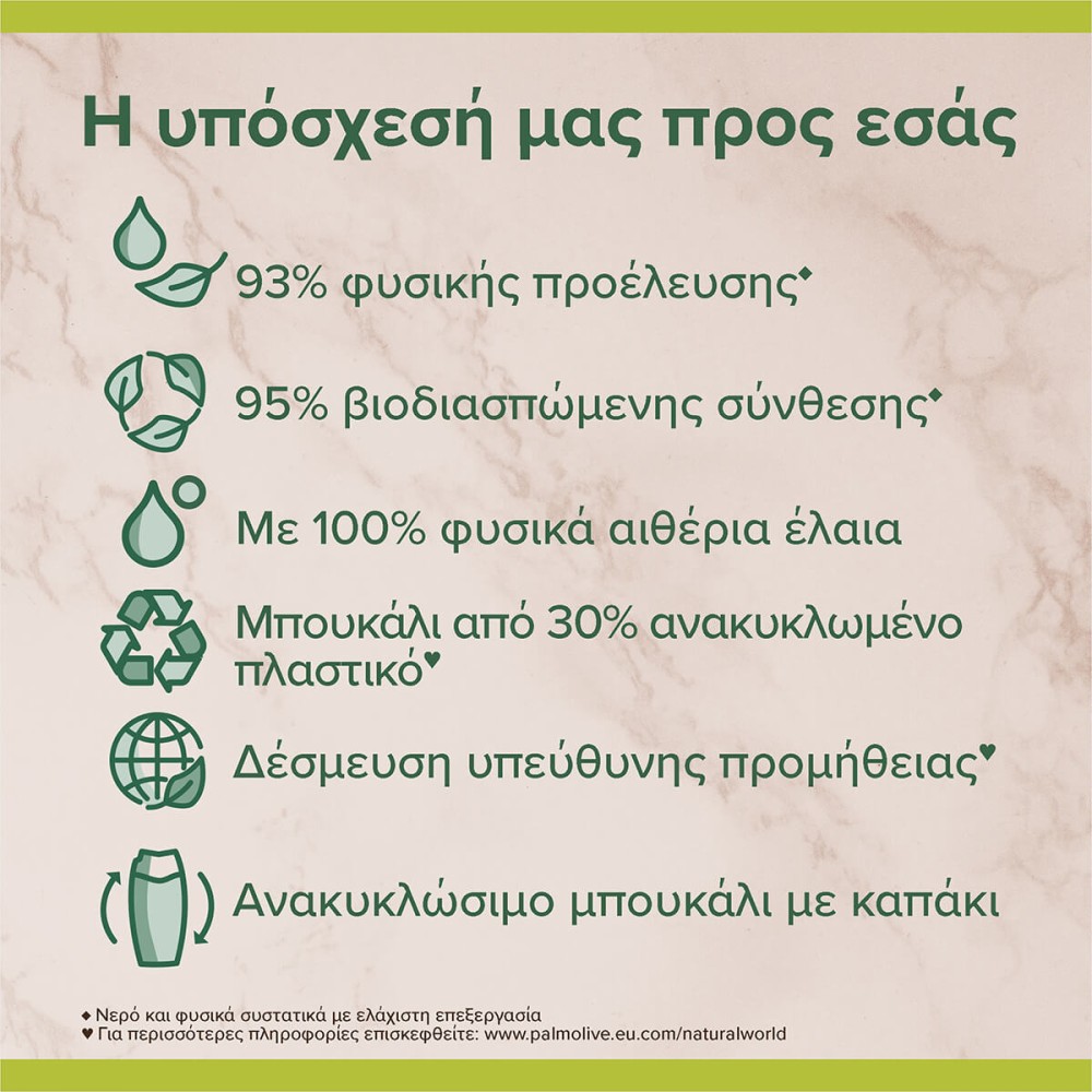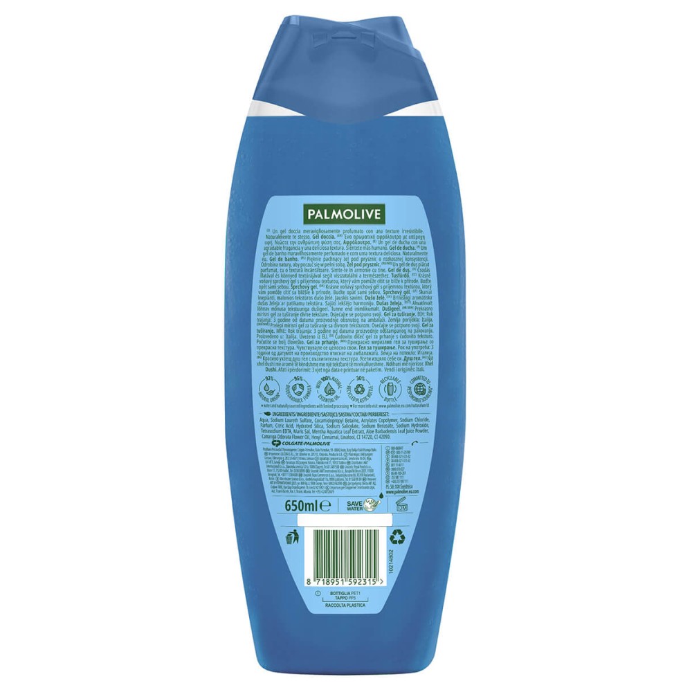 Το αφρόλουτρο Palmolive Thermal Spa Mineral Massage, εμπλουτισμένο με θαλασσινό αλάτι και αλόη, προσφέρει μοναδική αίσθηση φρεσκάδας και χαλάρωσης. Καθαρίζει απαλά την επιδερμίδα, ενώ η ευχάριστη υφή και το αναζωογονητικό άρωμά του χαρίζουν μια εμπειρία περιποίησης που σας φέρνει πιο κοντά στη φύση. Αφήνει το δέρμα απαλό, ανανεωμένο και γεμάτο ζωντάνια.
