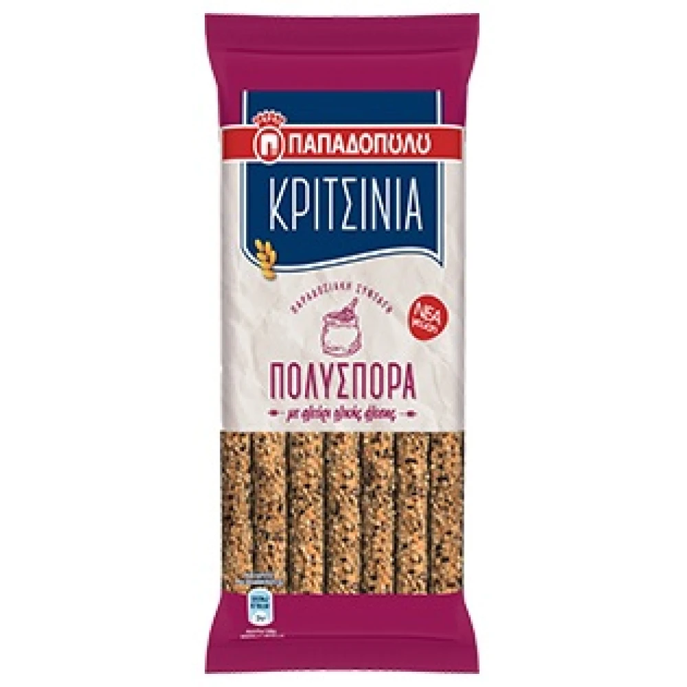 Τα Πολύσπορα Κριτσίνια ΠΑΠΑΔΟΠΟΥΛΟΥ με αλεύρι ολικής άλεσης παράγονται με την παραδοσιακή συνταγή, αγνά υλικά και πολλή φροντίδα. Τα υλικά ζυμώνονται, πλάθονται, καλύπτονται με εκλεκτούς σπόρους και στη συνέχεια σιγοψήνονται για να σας προσφέρουν αφράτα και νόστιμα κριτσίνια με τη διατροφική αξία της ολικής άλεσης, πλούσια σε εδώδιμες ίνες.
