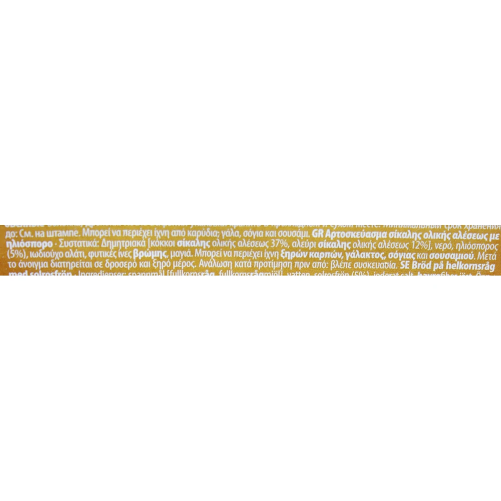 Δημητριακά, κόκκοι σίκαλης ολικής αλέσεως 37%, αλεύρι σίκαλης 12%, νερό, ηλιόσποροι 5%, ιωδιούχο αλάτι, φυτικές ίνες βρώμης, μαγιά. Μπορεί να περιέχει ίχνη ξηρών καρπών, γάλακτος, σόγιας, σουσαμιού. Μετά το άνοιγμα διατηρείται σε δροσερό και ξηρό μέρος. Ανάλωση κατά προτίμηση πριν την αναγραφόμενη ημερομηνία.