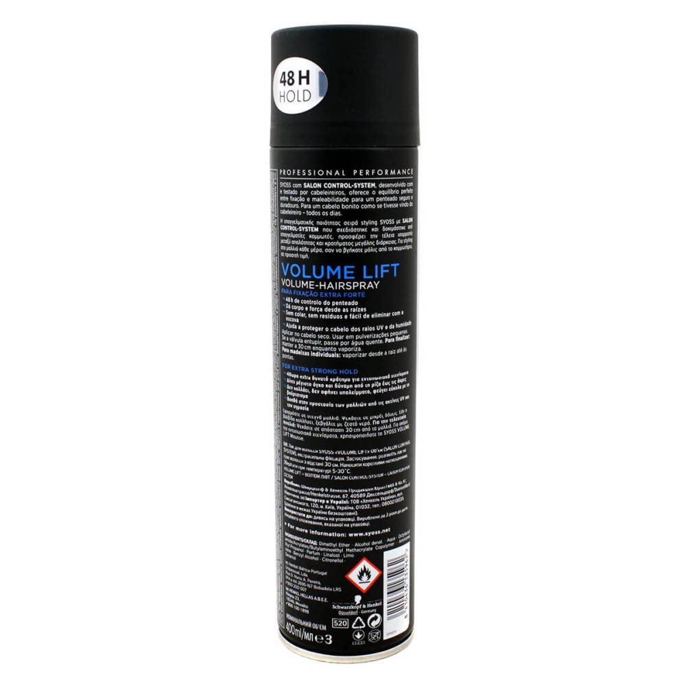 Με περισσότερα από 45 χρόνια ιστορίας στην περιποίηση μαλλιών, τα προϊόντα Syoss έχουν σχεδιαστεί για επαγγελματική απόδοση στο styling μαλλιών. Η 3 σε 1 φόρμουλα styling, περιποίησης, επανόρθωσης, για χτενίσματα μεγάλης διάρκειας με υγιή όψη - με σύμπλεγμα βιταμινών, συνδυασμό πανθενόλης και νιασιναμίδης, για ενδυνάμωση της δομής της τρίχας.Το Syoss Volume Hairspray παρέχει έντονο όγκο μαλλιών και αποτέλεσμα για μακράς διάρκειας ανόρθωση μαλλιών από τις ρίζες και πάνω. Παρέχει έως και 48 ώρες έλεγχο στυλ για φυσική εμφάνιση. Το Syoss Volume Hairspray προστατεύει το χτένισμα από την υγρασία, ενώ δεν αφήνει πίσω του κανένα κολλώδες ή υπολείμματα, και βουρτσίζεται εύκολα.